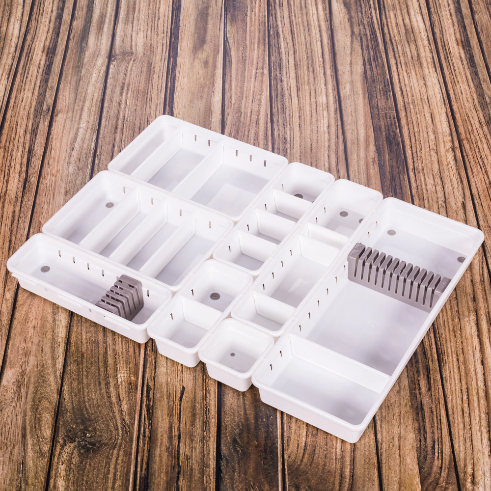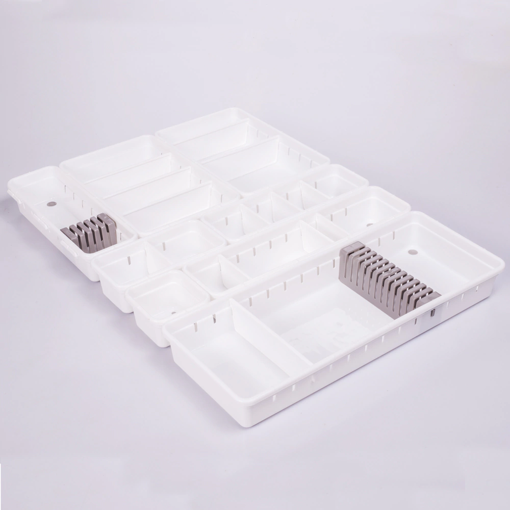 Conjunto organizador de gavetas e armários com divisórias removíveis..