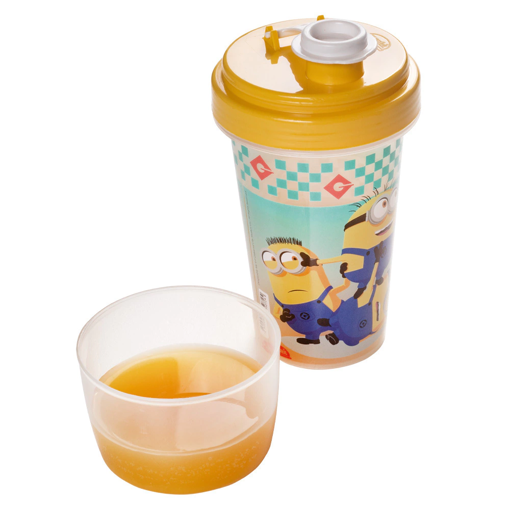 - A mini shakeira de 320 ml possui tampinha articulável emborrachada no bico (que facilita a abertura) e tampa para proteção que pode ser usada como copinho. É ideal para lancheiras ou bolsas de passeio.